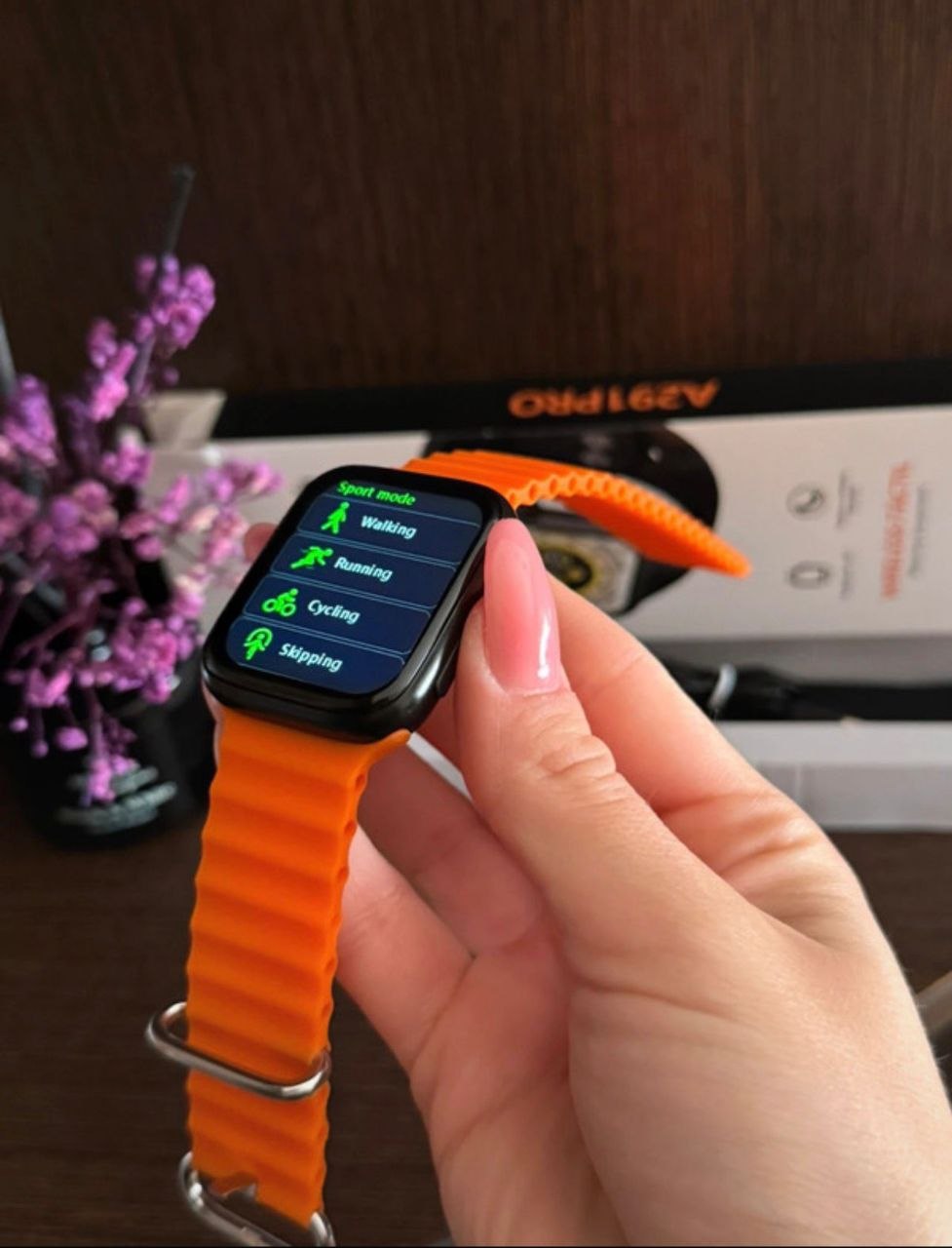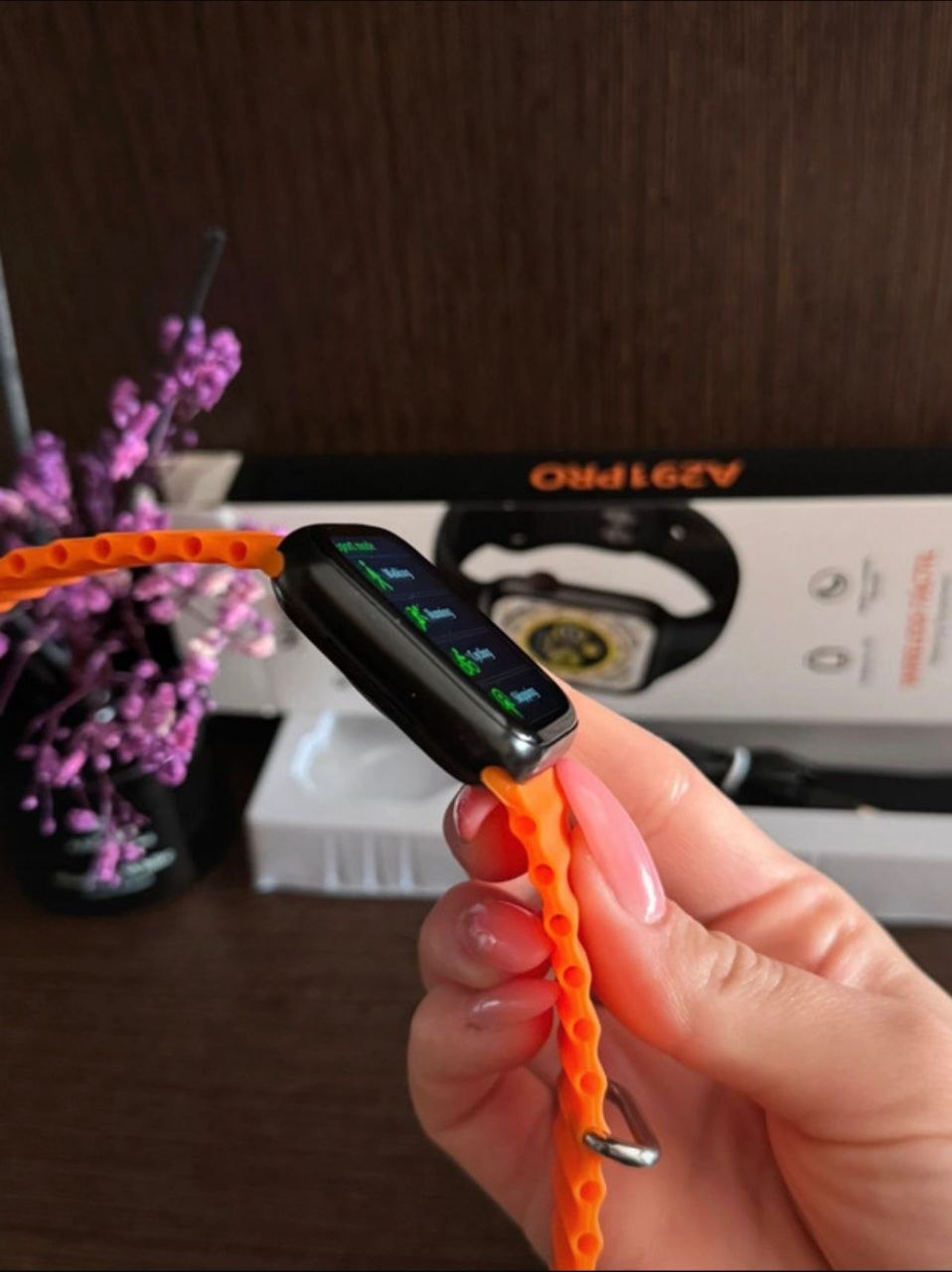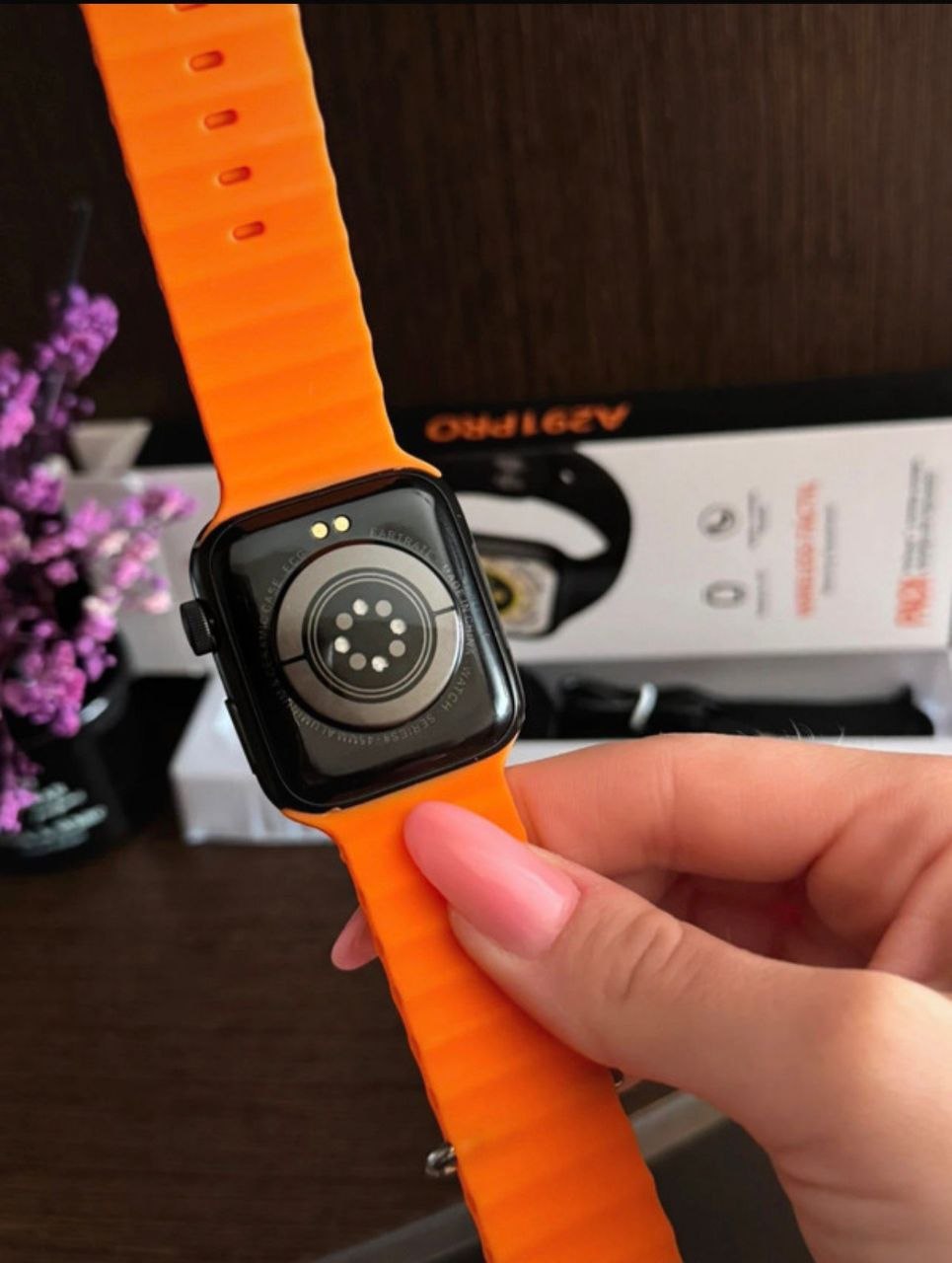 New high quality smartwatch with 2 different straps colors orange and black + charger Can receive calls, NOTIFICATIONS: on all social media platforms like WhatsApp, Facebook Instagram etc. screen touch, modern and stylish design. HEALTH: can monitor your heart rate, blood oxygen and sleep. SPORTS: pedometer, calorie counter, various sports modes